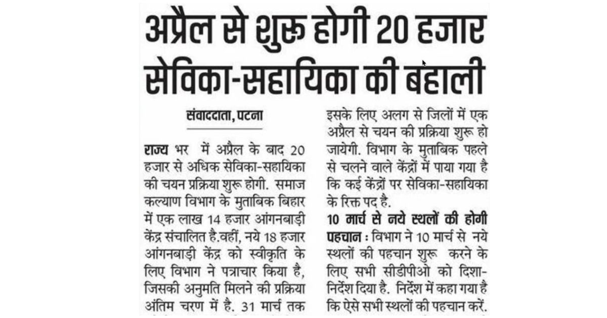 | आर्टिकल का नाम | Bihar Anganwadi Sevika Sahayika Vacancy 2026 |