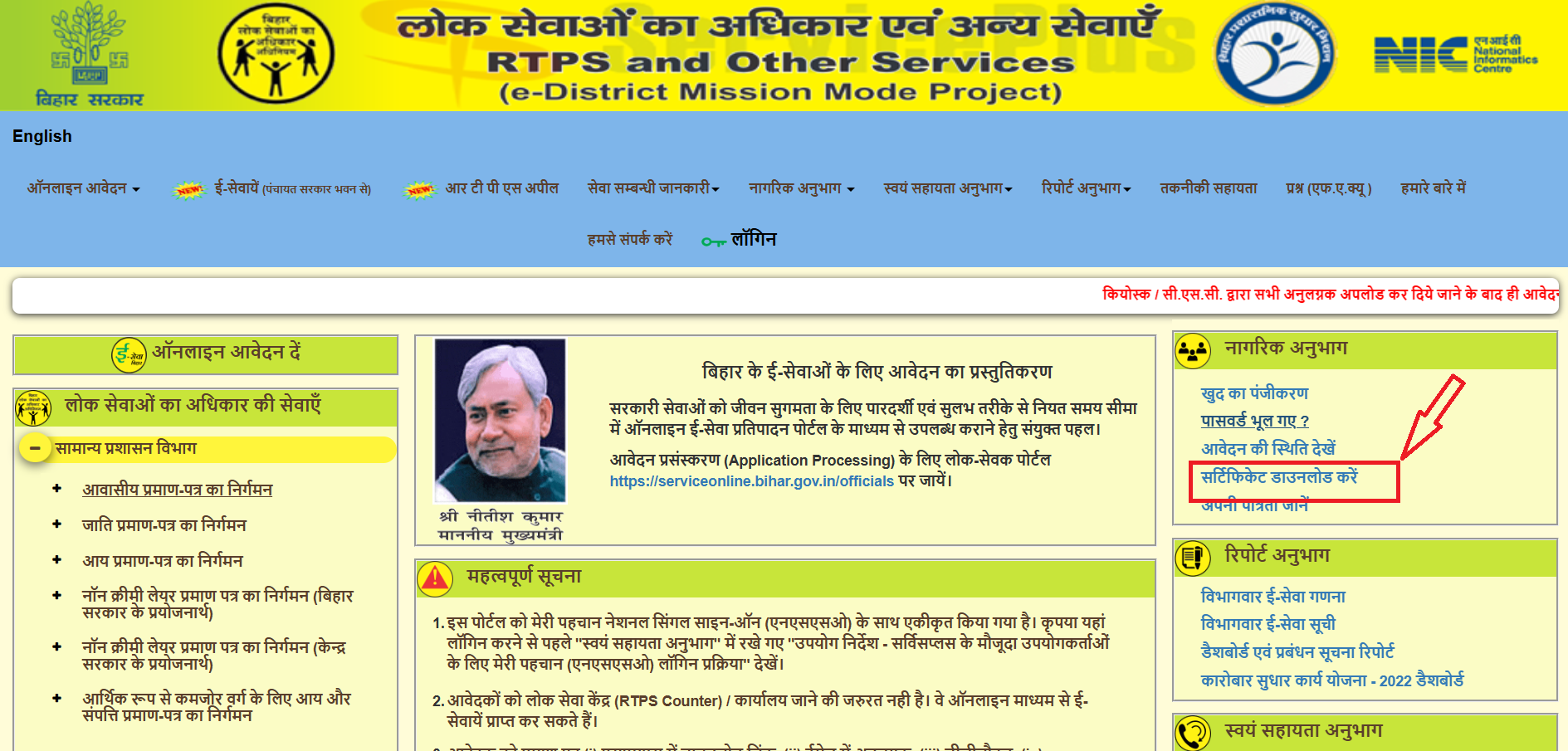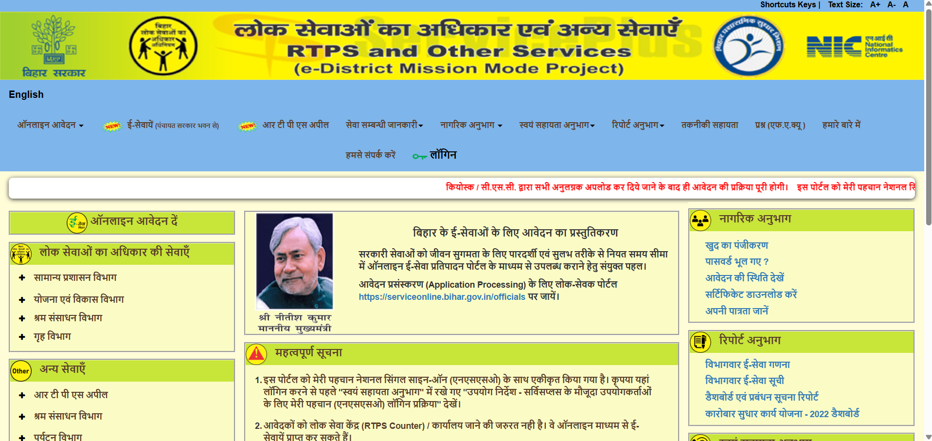 | आधिकारिक वेबसाइट | https://serviceonline.bihar.gov.in/ |